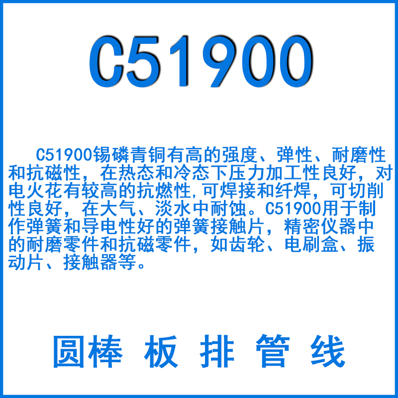 C51900錫磷青銅有高的強度、彈性、耐磨性和抗磁性,在熱態和冷態下壓力加工性良好,對電火花有較高的抗燃性,可焊接和纖焊,可切削性良好,在大氣、淡水中耐蝕。C51900用于制作彈簧和導電性好的彈簧接觸片,精密儀器中的耐磨零件和抗磁零件,如齒輪、電刷盒、振動片、接觸器等。