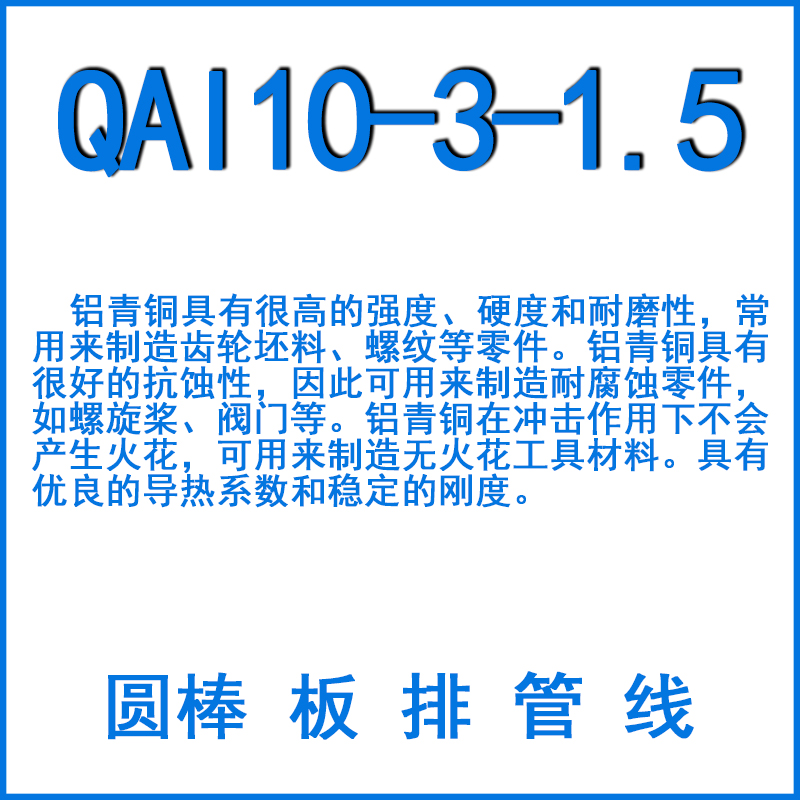 QAl10-3-1.5鋁青銅具有高的強度及耐摩擦性,不易釬焊,有較高抗氧化性和耐蝕性,QAl10-3-1.5用于制作高溫條件下的耐磨件和標準件,如齒輪,軸承,飛輪。