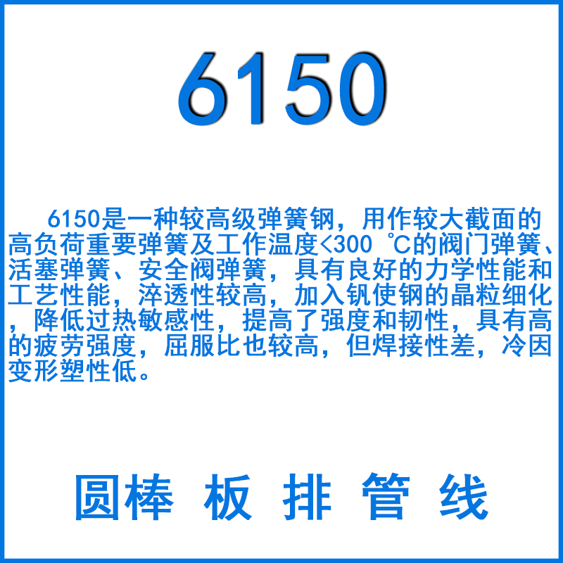 6150是一種較高級彈簧鋼,用作較大截面的高負荷重要彈簧及工作溫度<300 ℃的閥門彈簧、活塞彈簧、安全閥彈簧,具有良好的力學性能和工藝性能,淬透性較高,加入釩使鋼的晶粒細化,降低過熱敏感性,提高了強度和韌性,具有高的疲勞強度,屈服比也較高,但焊接性差,冷因變形塑性低。
