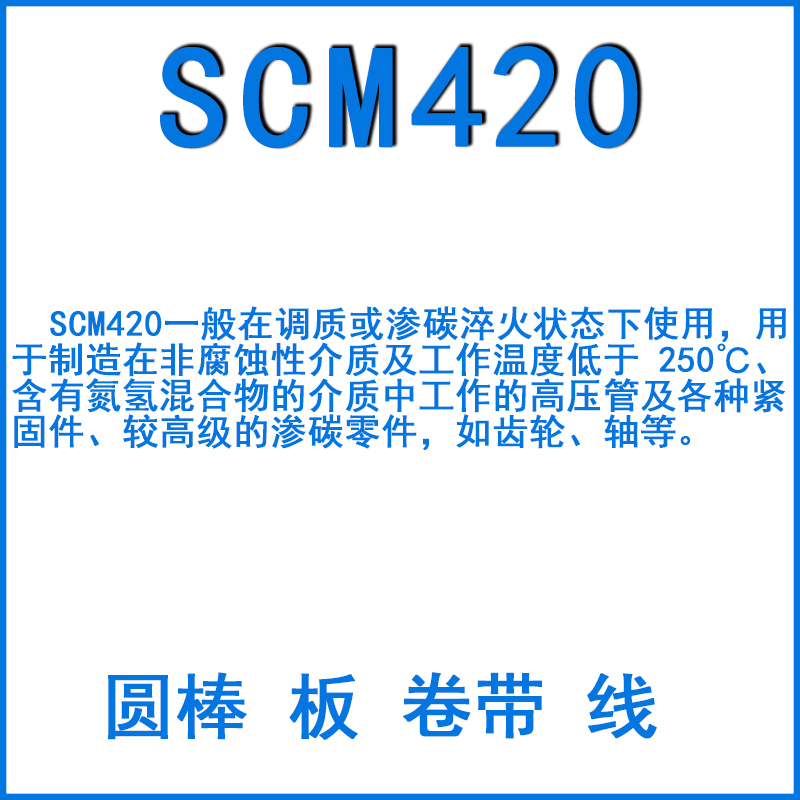 SCM420一般在調(diào)質(zhì)或滲碳淬火狀態(tài)下使用,用于制造在非腐蝕性介質(zhì)及工作溫度低于 250℃、含有氮?dú)浠旌衔锏慕橘|(zhì)中工作的高壓管及各種緊固件、較高級的滲碳零件,如齒輪、軸等。